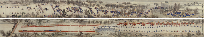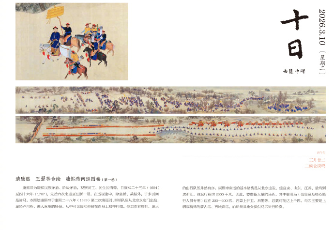 清康熙,王翚等合绘,康熙帝南巡图卷(第一卷)。康熙帝为缓和民族矛盾、阶级矛盾,视察河工、民生民情等,自康熙二十三年(1684)至四十六年(1707),先后六次南巡至江浙一带。在巡视途中,除坐轿、乘船外,许多时间是骑马。本图绘康熙帝于康熙二十八年(1689)第二次南巡时,率领队伍从北京永定门出发,途经卢沟桥,进入涿州的场景。从中可见康熙帝骑在白马上精神抖擞,侍卫左右簇拥,庞大的出行队伍井然有序。康熙帝南巡的基本路线是从北京出发,经直隶、山东、江苏,最终到达浙江,往返行程约 3000 千米。因此,要准备大量的马匹,其中御用马(仅皇帝及核心随行人员专用)应在 200—300 匹,若算上护卫、后勤等,总数可能达上千匹。马匹主要是上驷院精选的蒙古马、西域贡马,沿途州县也会提供马匹进行轮换。
