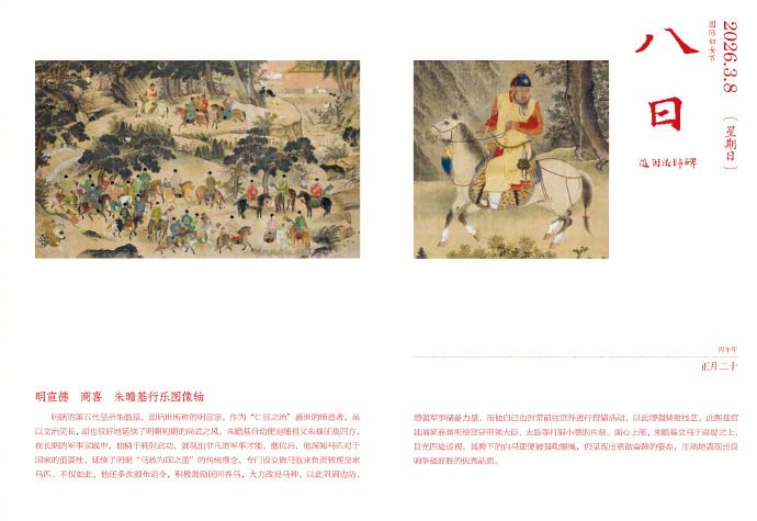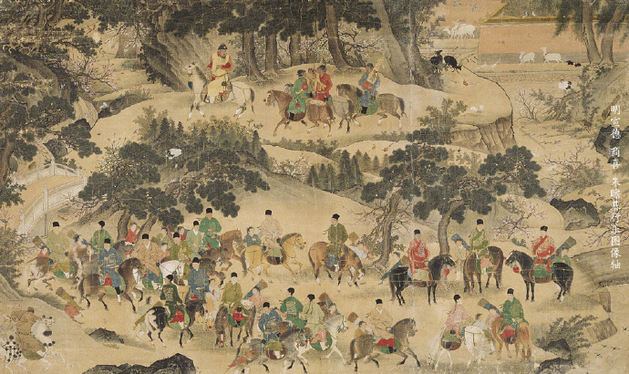 明宣德,商喜,朱瞻基行乐图像轴。明朝的第五代皇帝朱瞻基,即后世所称的明宣宗,作为“仁宣之治”盛世的缔造者,虽以文治见长,却也很好地延续了明朝初期的尚武之风。朱瞻基自幼便追随祖父朱棣征战四方,在长期的军事实践中,他精于骑射武功,展现出非凡的军事才能。继位后,他深知马匹对于国家的重要性,延续了明朝“马政为国之重”的传统理念,专门设立御马监来负责管理皇家马匹。不仅如此,他还多次颁布诏令,积极鼓励民间养马,大力改良马种,以此巩固边防、增强军事储备力量。而他自己也时常前往宫外进行狩猎活动,以此增强骑射技艺。此图是宫廷画家商喜所绘宣宗带领大臣、太监等打猎小憩的片刻。画心上部,朱瞻基立马于高坡之上,目光四处巡视。其胯下的白马即便被强勒缰绳,仍呈现出意欲奋蹄的姿态,生动地表现出良驹争强好胜的优秀品质。