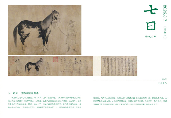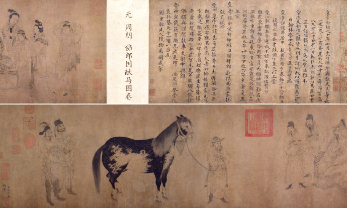 元,周朗,佛郎国献马图卷。依据相关史料记载,元至正二年(1342),罗马教皇派遣了一支规模可观的使团前往中国,使团历经长途跋涉,抵达中国后,元顺帝于上都的慈仁殿盛情会见了他们。会面之际,使者呈上了教皇的亲笔信件,同时,还献上了一匹精心准备的欧洲名马。此马身形极为高大,身长一丈一尺三寸,高度达六尺四寸,昂首时更是高达八尺二寸,整体姿态挺拔不凡,尽显雄健之姿。尤为引人注目的是,它身上的花纹犹如精心设计过的图案一般,独具艺术美感。元顺帝见此马龙颜大悦,认定此乃天赐神驹,喜爱之情溢于言表。为铭记这一珍贵时刻,元顺帝特意下令宫廷画师周朗,将此次献马的盛大场景细致描绘下来,以作永久纪念。