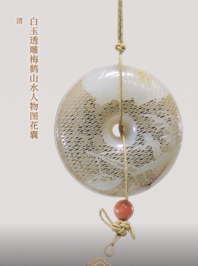 白玉透雕梅鹤山水人物图花囊