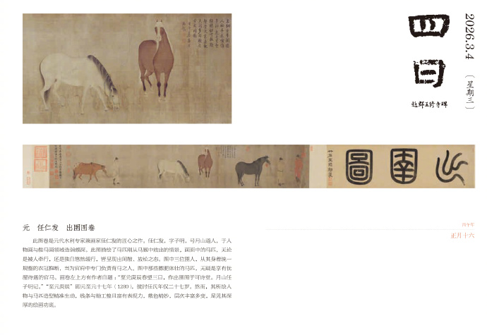 元,任仁发,出圉图卷。此图卷是元代水利专家兼画家任仁发的匠心之作。任仁发,字子明,号月山道人,于人物画与鞍马画领域造诣颇深。此图描绘了马匹刚从马厩中放出的情景,画面中的马匹,无论是被人牵行,还是独自悠然缓行,皆呈现出闲散、放松之态。图中三位圉人,从其身着统一规整的衣冠推断,当为官府中专门负责育马之人。图中那些膘肥体壮的马匹,无疑是享有优渥待遇的官马。画卷左上方有作者自题 :“至元庚辰春望三日,作出圉图于可诗堂。月山任子明记。”“至元庚辰”即元至元十七年(1280),彼时任氏年仅二十七岁。然而,其所绘人物与马匹造型精准生动,线条勾勒工整且富有表现力,敷色精妙,层次丰富多变,足见其深厚的绘画功底。