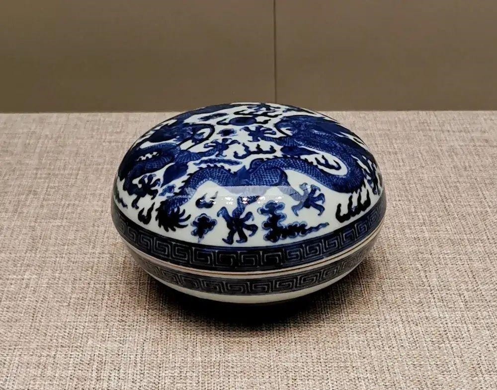 罐盖上绘有两组竹叶,罐腹主体纹样类似一幅生动、自然的山水,坐落于深山密林的村舍,营造出静谧闲逸的气氛。从清朝早期开始,青花 icon彩绘使用了“分水”技法,因此提高了青花的表现能力,不论远山近水、跌宕高古、层峦叠嶂,还是阴阳反侧、疏落茂密,均能得心应手。