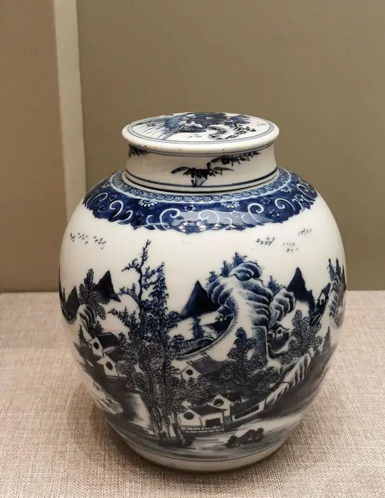 青花山水盖罐