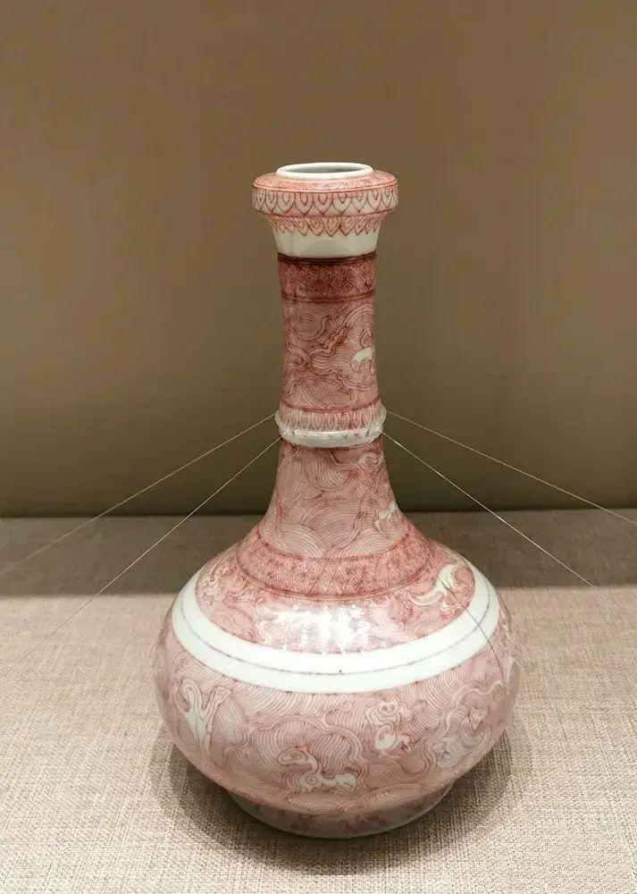 口、颈有凸棱,蒜头形口、圆唇、细长颈、溜肩、扁圆形腹,浅圈足。此类器型始见于秦代青铜蒜头,宋元时开始仿制。通体施透明釉及釉里红图案,ロ沿为荷花瓣纹及三角纹;颈上、中部各有一条宽带纹;肩腹分界是一弦。