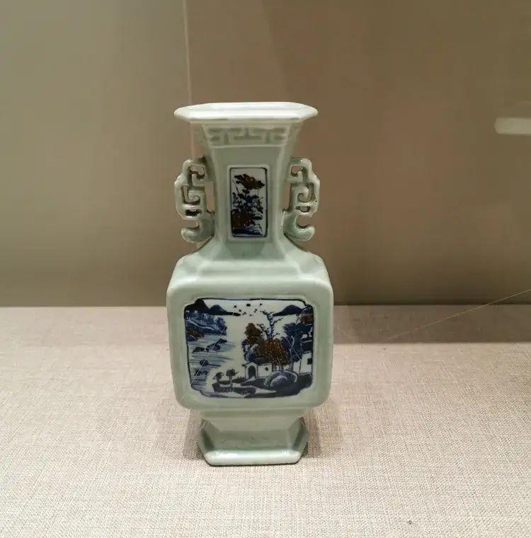豆青釉青花釉里红双耳方瓶