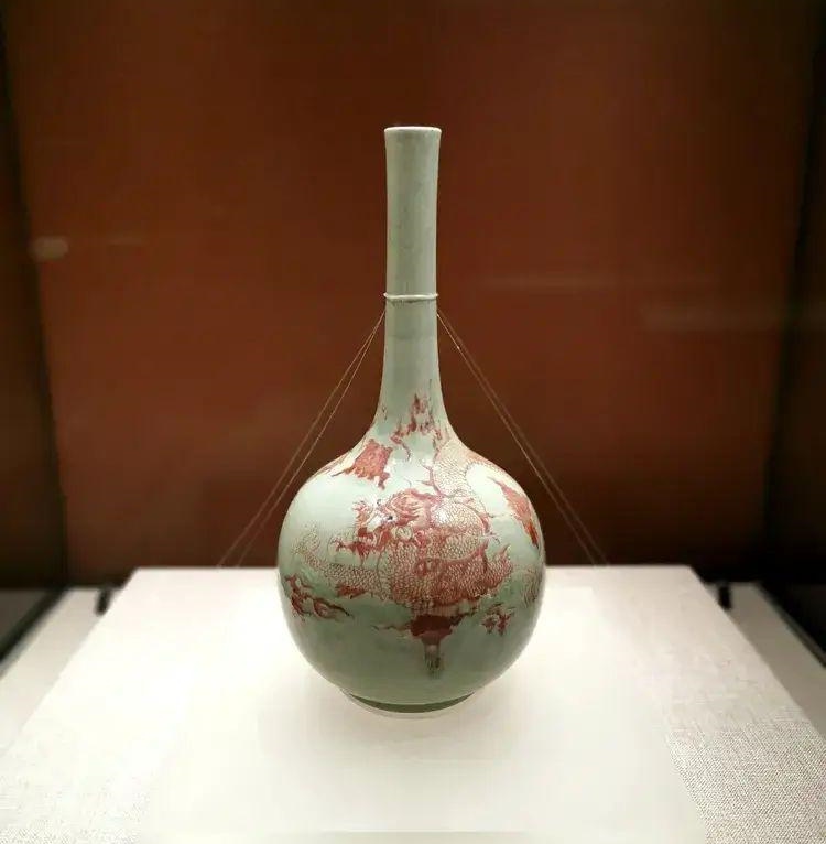 直口、长颈、圆腹、圈足。通体施淡青釉,颈口及器身局部釉面有细开片,釉色莹润。腹部以釉里红描绘一四爪蛟,周围饰以云气及火焰,图案充满动势。圈足刮釉露胎,外底白釉无款。