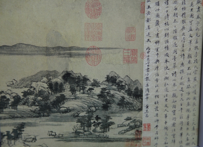 将近七百公分的长卷,观看者如坐舟中,舟行江上,忽远忽近,忽快忽慢,两岸山势随季节晨昏晦明,变化莫测。