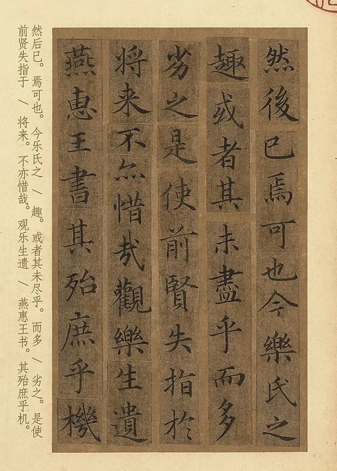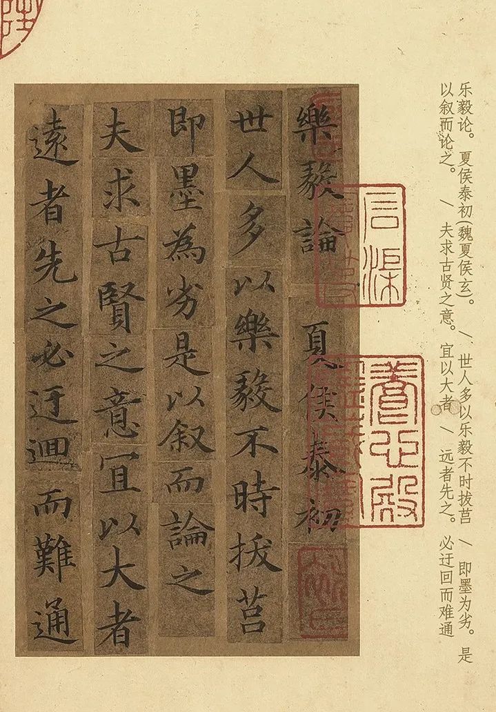 这幅《宋人摹褚遂良小楷乐毅论》毫无这种问题,不仅具备小楷的端庄特性和优点,还有褚遂良的绰约变化,王羲之笔法,以及宋徽宗的爽利之姿。