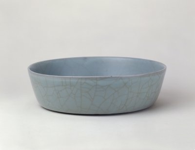 洗敞口,器身近直,洗里坦平,圈足矮宽,底部边沿露胎无釉。造型端庄典雅。通体施青釉,釉呈粉青色,纯净莹澈。釉面上,金丝般的开片纵横交织,片纹间又闪现出条条冰裂纹,优美和谐。