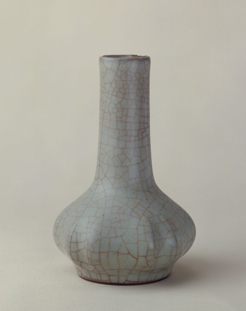 瓶直口,颈部细长,腹部由凹凸的棱线形成似蒜头状的形体,圈足。通体施青灰色釉,釉面开片,开片较大且遍布器身。