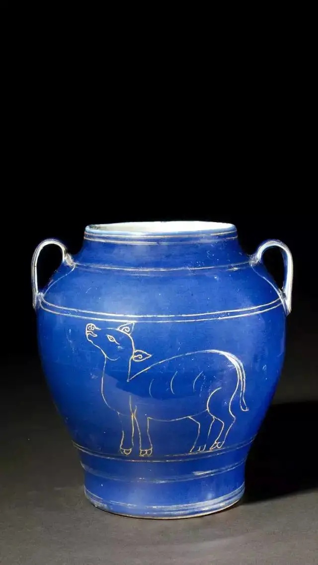 [明·弘治] 御窑祭蓝釉描金牛纹双耳尊