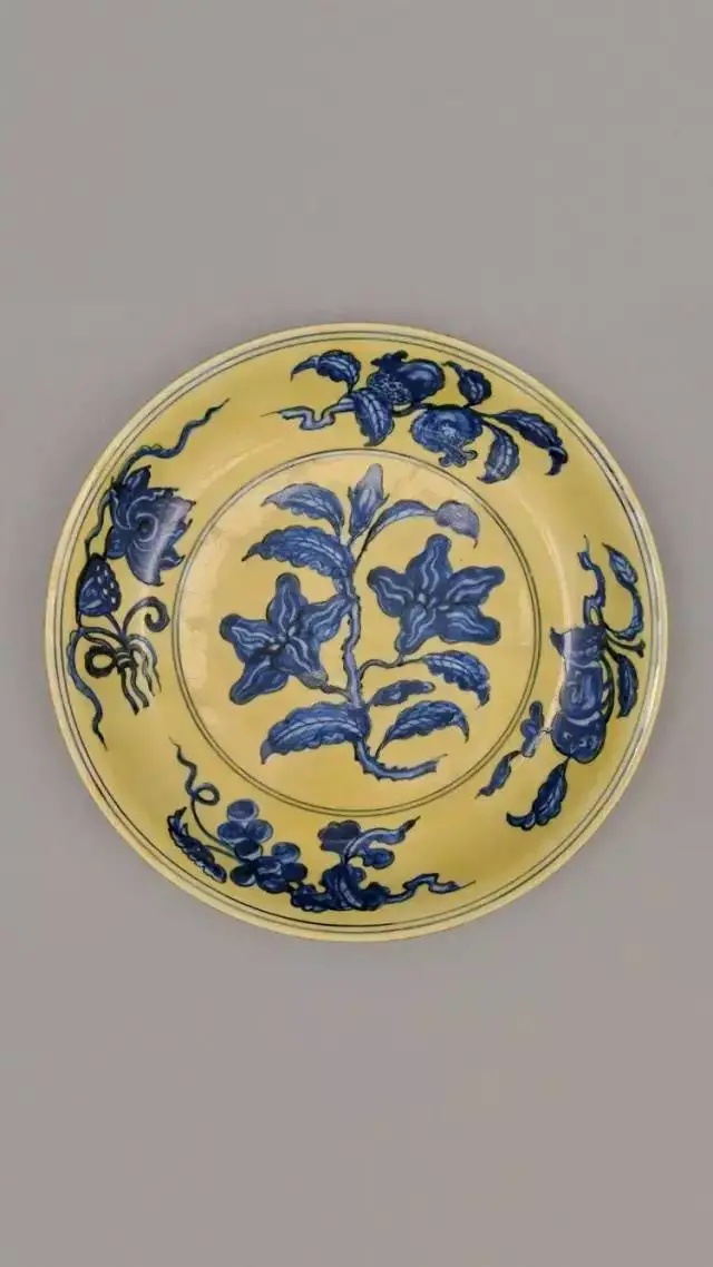 黄地衬托蓝花,给人以温馨素雅之美感。该品种创烧于宣德朝景德镇御器厂,后来成化、弘治、正德、嘉靖等朝均有烧造。