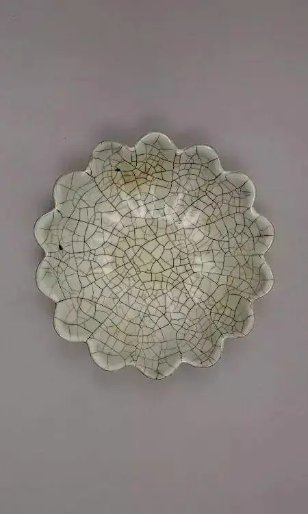 中国古代艺术家和陶瓷工匠在设计陶瓷造型时,善于从大自然动、植物中获得灵感,蛙形、虎形、 葵花形、菊花形等造型屡见不鲜。这件菊瓣式盘造型规整,灰青色釉素裹,交织如网的开片纹妙趣天成,堪称古陶瓷模仿花朵造型的典范。清宫旧藏传世哥窑灰青釉菊花式盘有两件,除此件以外,另一件现暂存于台北故宫。