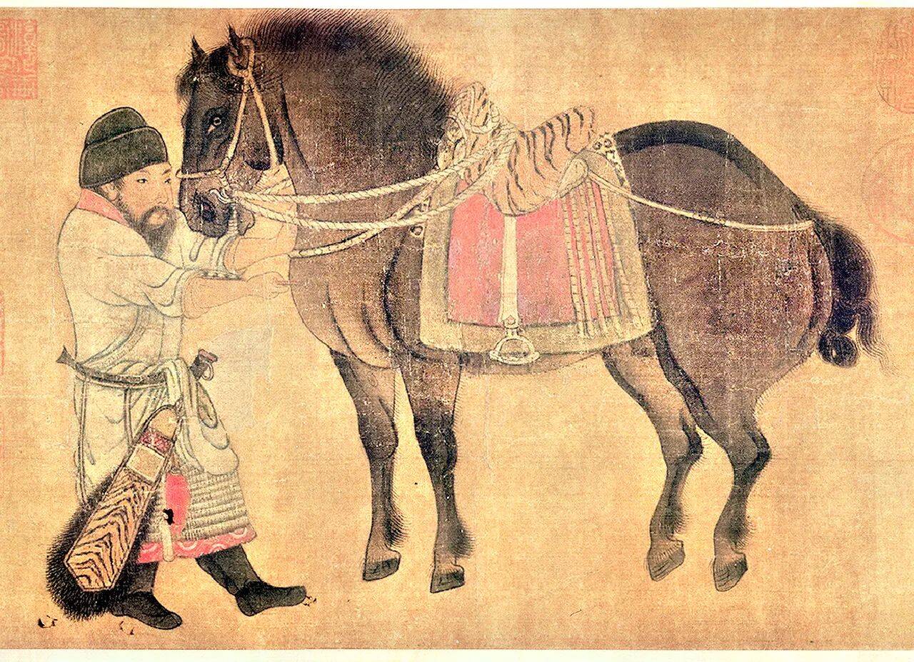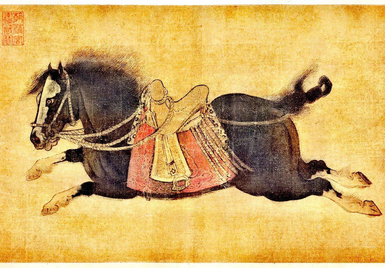 该画以唐代昭陵六骏石刻为蓝本,通过细腻笔法和浓重设色,生动再现马匹动态与战马精神。其中"飒露紫"一段尤为精彩,刻画了丘行恭为中箭战马拔箭的感人瞬间。画风融合唐宋技法,尤见韩干遗韵,是现存唯一完整再现六骏原貌的绘画作品,兼具艺术与历史价值。