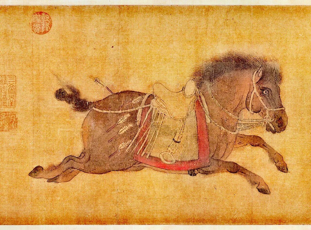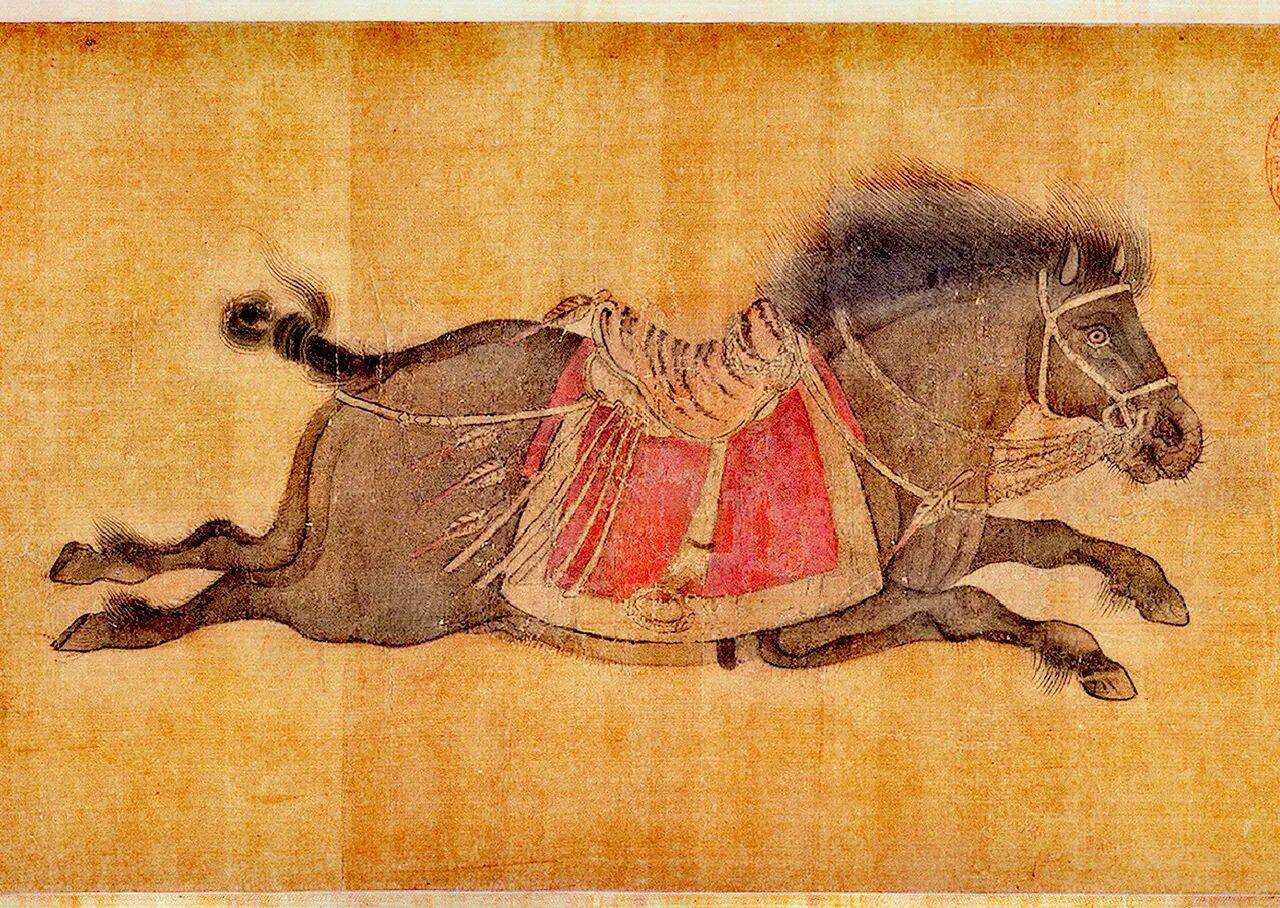 《昭陵六骏图》是金代画家赵霖创作的绢本设色画,现藏于北京故宫博物院。全卷纵27.4厘米,横444.9厘米,分六段描绘唐太宗李世民的六匹战马(飒露紫、拳毛騧、白蹄乌、特勒骠、青骓、什伐赤),每段附有金代赵秉文题写的赞文。