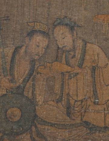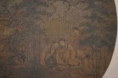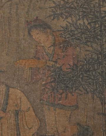 此图绘溪边竹林下,三位文士,身着长袍,对坐于兽皮垫上。姿态各异,或拨阮,或凝听。旁有一童子侍候,一童子跪伏溪边汲水。图中人物生动传神,衣纹细劲流畅。衬景丛竹老树,疏密、远近、浓淡相间,错落有致。全幅构图丰满而不拥塞,应为南宋绘画中的佳作。