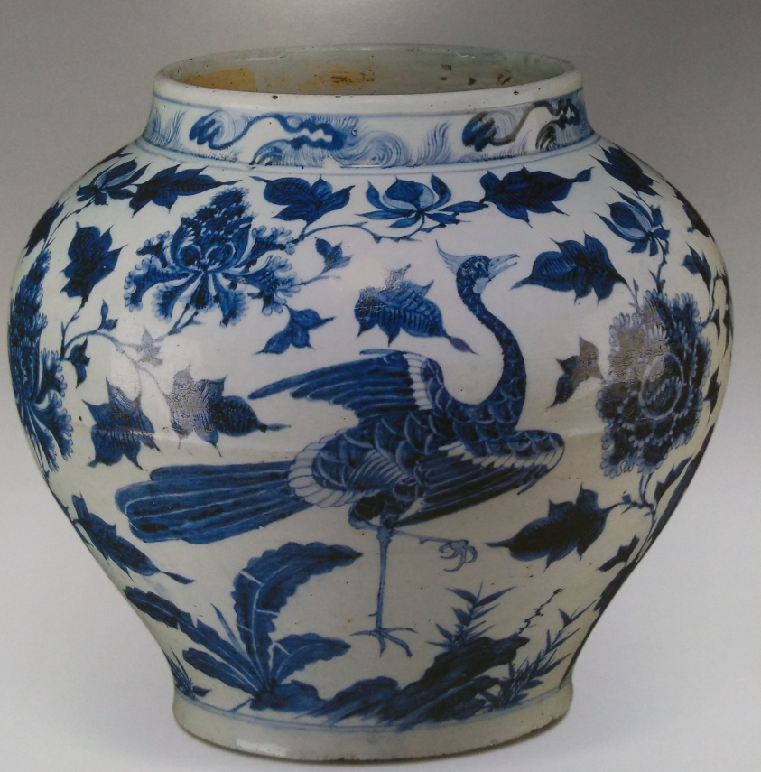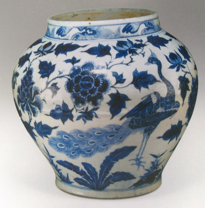 这件青花孔雀牡丹纹罐,直口,短颈,圆肩,腹部以下渐收,足端微微外撇,矮圈足,底部无釉,口沿装饰海水波涛纹,罐身饰缠枝牡丹及孔雀一对。牡丹分别以正,侧,仰,俯等不同视角表现,姿态万千,雍容华贵,孔雀一雌一雄,一个回首凝视,另一个昂首舞动,一静一动,互相呼应,胎体厚重。青花发色浓艳,釉色白中闪青。牡丹叶子为典型的葫芦型叶子,足胫装饰有山石,竹叶,芭蕉等纹饰,整个画面显得生动和谐。
