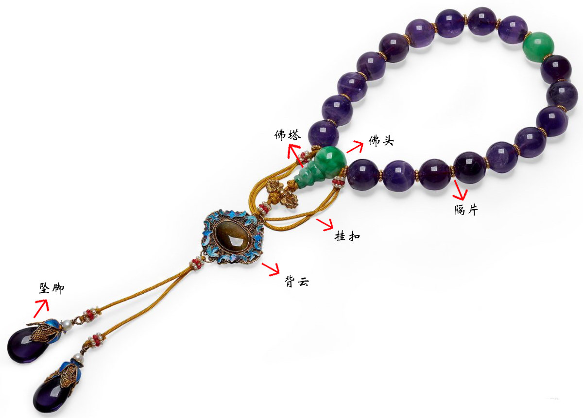 一般选用十八颗小圆珠,中间加两颗精致大气的佛头、一佛头塔和坠脚组成,也可加背云等饰件。