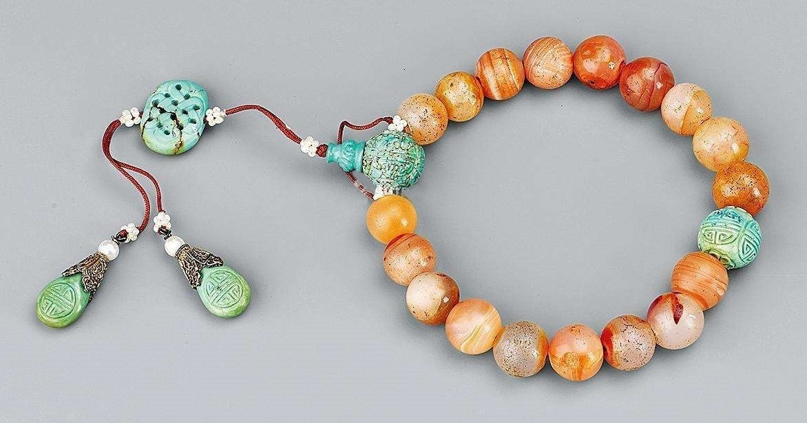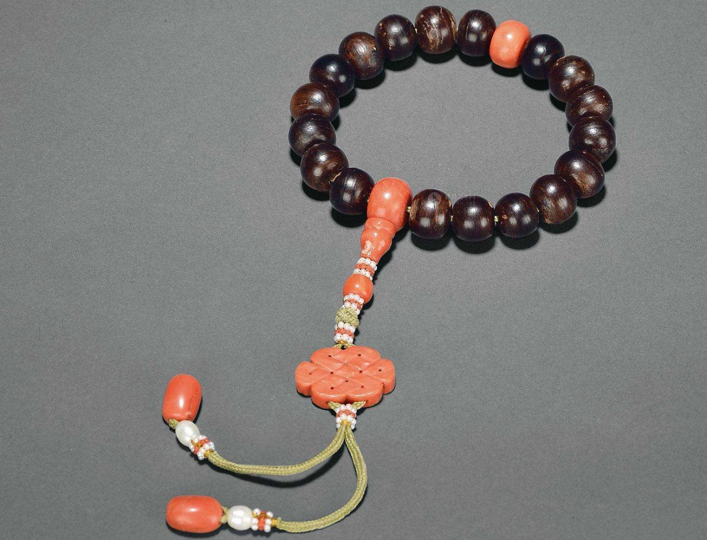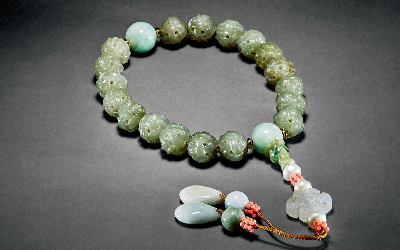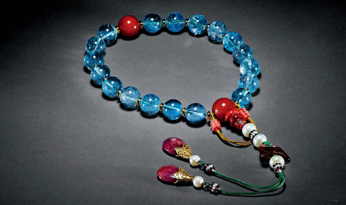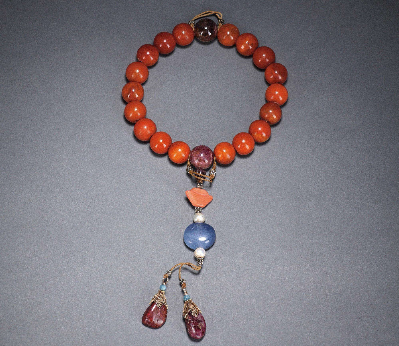 清宫手串选材多样,多以珊瑚、碧玺、翡翠、青金石、玛瑙、蜜蜡等为主,坠角用翡翠、珊瑚、珍珠、碧玺等装饰。