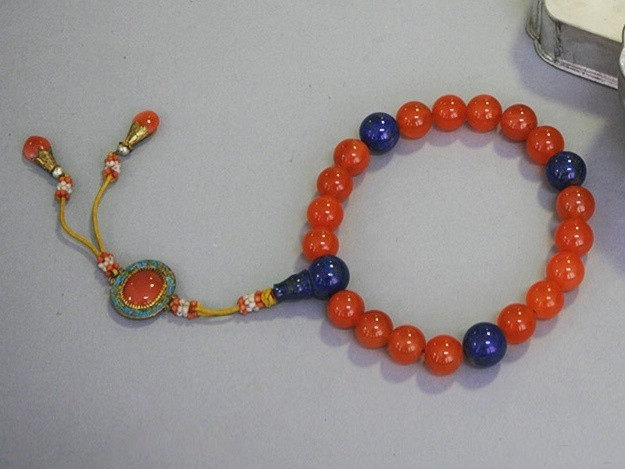 手串长31cm,直径12cm,清,共红玛瑙十八颗,青金石结珠三颗。青金石佛头及佛头塔装饰以珊瑚珠与米珠。背云为点翠椭圆牌,中央镶嵌椭圆形红玛瑙一块,其下装饰珊瑚珠与米珠。坠角为镀金钟形嵌件,嵌镶红玛瑙两颗,上装饰小珍珠一粒。此手串选用红色玛瑙配以青金石,明艳又不失稳重,端庄又华丽。