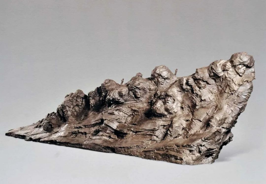 东北抗日联军在长达14年的抗战历程中涌现出无数英雄人物与事迹,他们于白山黑水之间铸就了中华民族保卫和平的英雄史诗。以“东北抗联”为表现主题的作品《关东魂》是一件极具悲剧色彩和艺术张力的雕塑杰作,予观众以强烈的视觉冲击、心灵震撼和精神感染。为适应峻岭雪原的作战环境,“抗联” 部队常分散成游击小队并持续展开与日军的周旋。队伍在夜间作战时常常来不及安营扎寨,为了维持作战状态和应对敌军侵扰,他们会保持全副武装在村庄或山脚隐秘处相拥而眠。作品《关东魂》生动地再现了游击队伍在深夜小憩期间突遇敌军来袭的惊险时刻,表现了战士们一边迎战一边撤离的英勇场面。整个作品的形体空间呈倾斜的三角形,18 个人物的身躯互相穿插,从 左下角向右上方形成剧烈的递进和升腾趋势。战士们形态各异,英勇刚毅的队长、稚气未退的男孩、眉宇清秀的教员等,他们中有人紧挨队友,有人奋勇向前,有人保护队友。战士们满脸疲惫,小男孩在哈气取暖,也有战士睡眼惺忪,尽管如此,他们仍在一瞬间破雪而出并投入战斗。艺术家概括地将人与人、战士与地面等连接处处理成体块,很好地把积雪的特征与雕塑的美感融合到一起。写实与写意的有效结合是这件作品最为鲜明的艺术风格。圆雕与浮雕、平面与空间、加法与减法、雕刻与塑造,艺术家自由地运用了各种雕塑手法,形成犹如斧劈的力量感、揉按的细腻感、敲击的挤压感、刀刻的利落感,显示出艺术家对雕塑语言自如的把控度。作品中既有对不同人物性格和情绪的生动捕捉,又有洗练概括、洒脱豪放的块面与线条;既有寒冷深邃的夜晚氛围,又有火热激昂的杀敌斗志。圆浑与凌厉的体块关系、具象与抽象的造型结构、内收与外放的动态张力,都彰显出艺术家对中国传统艺术精神和西方雕塑语言交融互鉴的深刻理解及成功探索。