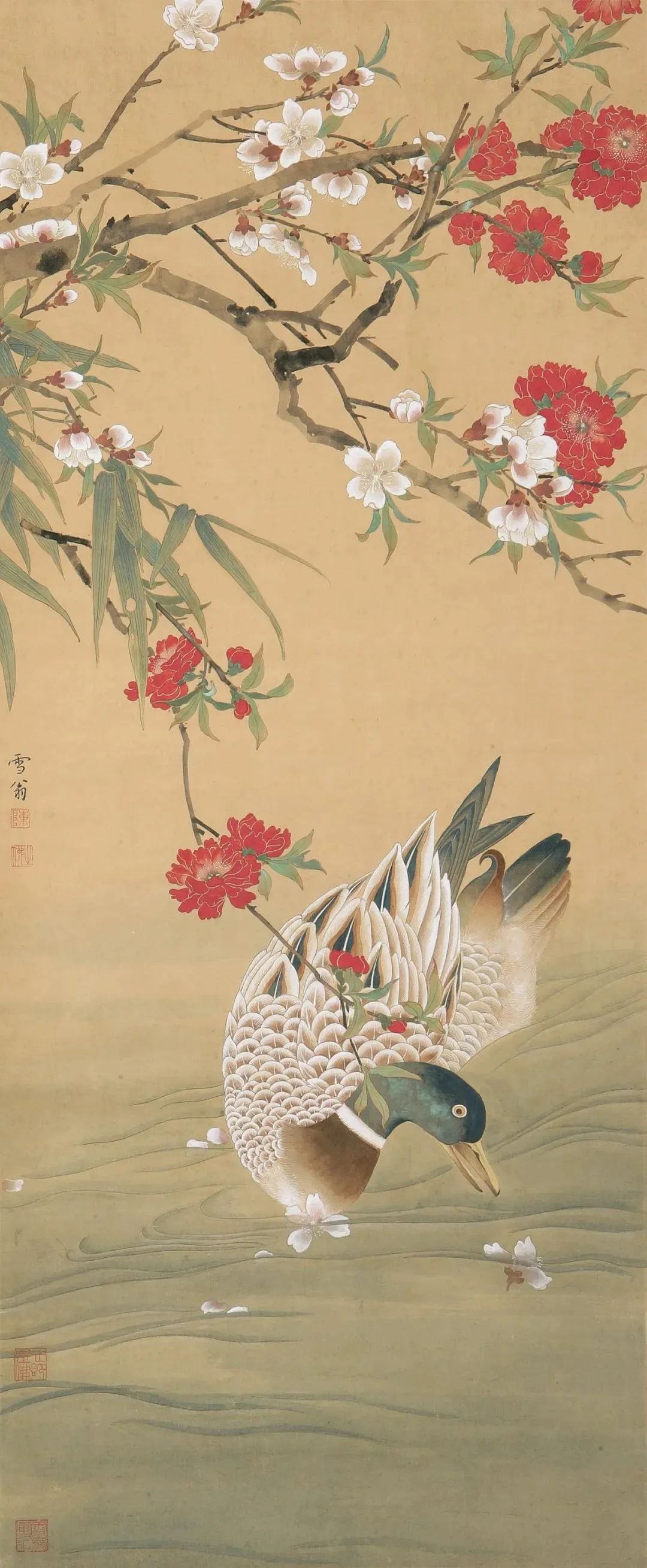 陈之佛,原名绍本,又名子伟、杰,号雪翁,浙江省慈溪市人,我国著名工笔画家,工艺美术的先驱,美术理论家和美术教育家。陈之佛既深植传统,入古出新,又具备丰富的图案设计经验和高超的西画技巧,博采东西艺术之所长,在强调艺术民族性和时代精神的同时,从现代美学视角观照工笔画艺术创作,重新阐释和发掘了工笔花鸟画之精华,扭转了近代中国工笔花鸟画式微的局面,并将工笔花鸟画推到一个崭新的历史高度,成了传统工笔花鸟画变革的扛鼎之人。陈之佛认为:“花鸟画很讲究形式美,一幅优秀的花鸟画,往往是形式美的处理最得法,也是最符合人们欣赏要求的东西;而表达花鸟画上的形式美,主要又在构图和设色两方面。”构图与设色便成为陈之佛工笔花鸟画形式美感的重要表现路径。《桃竹花鸭》便是构图和设色相得益彰的佳作。该画取“春江水暖鸭先知”之诗意,采用中国传统工笔花鸟画的竖幅折枝式构图,笔意通达畅神,设色丽中见雅。点点桃花,红白相间,几枝摇曳的绿竹穿插其间,更显桃花娇艳。一只色彩斑斓的鸭子悠然自得地在水中嬉戏,呈现出一派生机盎然的景象。画面有自上而下的动势,花枝从画幅的左上角起,逐渐向右下发展延伸,引出花下戏水逐花的鸭子。画面下部的色调以素雅的冷色为主,画面上部的色调以热闹的暖色为主,一冷一暖、一动一静,一派和谐清新的画面。
