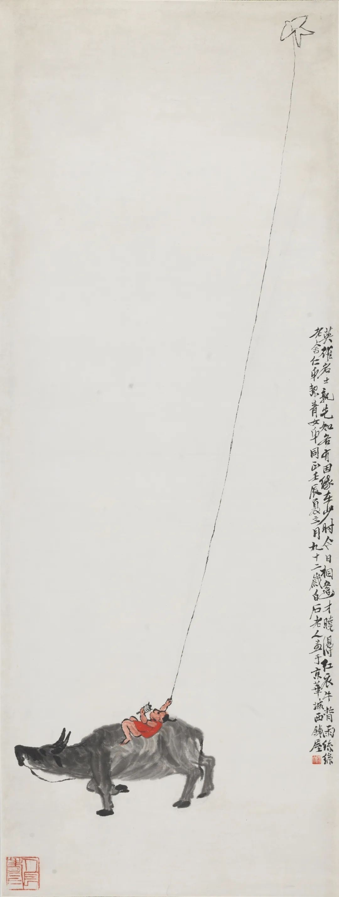 “英雄名士孰先知,各有因缘在少时。今日相逢才晓得,红衣牛背雨丝丝。”这是齐白石在其国画《红衣牛背雨丝丝》上所提诗文。《红衣牛背雨丝丝》作于1952年,疏朗的画面中,描绘了一名玩兴大发的牧童,他躺骑牛背,于和风细雨中怡然自得的放风筝。水牛昂首踏进,风筝逆风舞动,两者的角力为作品带来一份升腾与跃动。秉持对“似与不似之间”的追求,齐白石通过对物象的提炼和简化,对线条的灵活运用,乃至对题跋位置的巧妙经营,使作品具有超越传统的视觉效果。