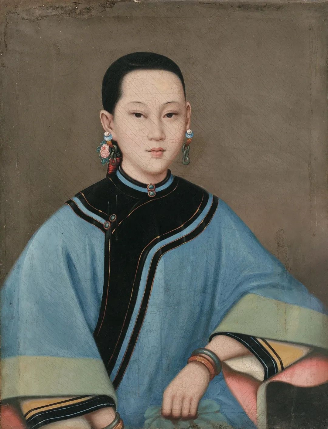 这幅蓝衣美人作品源自19世纪广州外销画市场中的油画肖像画。画中女子左臂搁在桌子上面,呈端坐姿势。其所穿的大襟衫正是清末民间女子上衣最常见的款式,大襟衫一般为立领,右衽,大襟掩小襟至腋下,以纽扣固定两侧开衩,衣长至膝。大襟衫的袖口宽一尺有余,宽袖内还露出窄袖,追求层叠的美感。画中女子发型为19世纪清代女子常见的圆髻,后有花饰。耳戴三环宝珠圆环状翡翠耳坠,手戴绿、黄二色翡翠手镯,从画中人的衣服、首饰可以判断画中女子是晚清汉族女子的装束。画面色彩主要以固有色来描绘,画风细腻逼真,特别是脸部和手部的刻画,通过肤色色调在结构中的微妙过渡,塑造出皮肤白皙细嫩的佳人形象。画中人物20岁上下,从嘴角表情中透露出女子内心的青春气息。这是一个标准的清式美人样式,细眉、大眼,樱桃小嘴,瓜子脸,皮肤白皙。作为清末外销画中的美人画,相同的款式有多幅流传于世,其中香港艺术馆收藏的同类作品名为《贵妇像》,有学者研究认为画中人为香港胡姓家族的四姨太。将中国美术馆的藏品和香港艺术馆的《贵妇像》进行比较,中国美术馆的这件藏品似乎是个简化本,构图时省却了右手,左手拿手绢向下的食指也收缩回来,无名指与小拇指上的戒指也不见了,大襟衣上的襟边花纹与胸前的挂饰也省去了,原本发饰上端的花饰也转移到脑后的发髻之下,画面之中光影所体现出来的人物的体积感被逐渐消解和减弱。再比较五官的刻画,中国美术馆藏品中的人物是朝着晚清时期标准的美人的范式去描绘的,它褪去了贵族妇女的贵气,美人的面庞也更加年轻漂亮,这是迎合大众审美的改造。