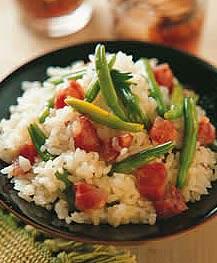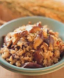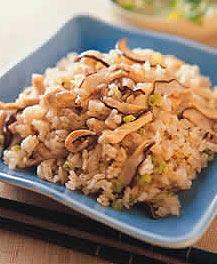 3.蘑菇火腿饭材料:蘑菇10个洋葱丁1/4杯火腿1/4杯巴西里粉1/2大匙五榖米1杯白米1杯水2杯调味料:盐2小匙胡椒粉1小匙糖1/3大匙橄榄油1大匙做法:(1)将蘑菇洗净沥干,切片备用。(2)将五谷米洗净沥干水分,加入1杯水浸泡3小时,再将白米洗净加入1杯水浸泡15分钟,最后将两种米(连水)混在一起备用。(3)将平底锅预热,加入橄榄油,将洋葱爆香,蘑菇、火腿放入略拌炒,再加入其它的调味料翻炒均匀,起锅后,铺在米上。(4)放入电饭锅中煮熟,开关跳起后,再焖20分钟,最后洒上巴西里粉,用饭匙轻轻拌匀即可。