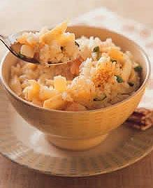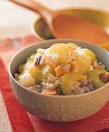 16.青豆桂花饭材料:青豆仁1杯白米2杯水2杯调味料A:香油2小匙盐2小匙酒1大匙调味料B:糖1/2大匙桂花酱1/3大匙做法:(1)白米先洗净,加入2杯水,稍微浸泡15分钟。青豆仁洗净沥干,加入米中。(2)把调味料A放进去稍微拌一下,然后放到电饭锅中,按下开关。(3)开关跳起后先不要打开锅盖,让饭焖约15~20分钟左右,然后打开锅盖,加入调味料B再用饭匙由下往上搅拌均匀即可。使用新鲜的青豆仁不需要增减煮饭的水量,因为青豆仁本身所含的水分,已经足够让青豆仁熟透。