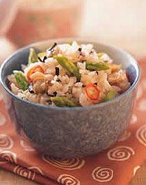 12.芦笋蛤蜊饭材料:芦笋6支蛤蜊1/2斤海苔丝1大匙姜丝1大匙辣椒片1大匙白米2杯水2杯调味料:红酒醋2大匙糖1/2大匙盐1小匙香油2小匙胡椒粉1小匙做法:(1)将芦笋洗净,切成2~3公分段。蛤蜊泡水约3小时,吐沙备用。(2)将米洗净,沥干水分,加入2杯水浸泡15~20分钟,再加入调味料、姜丝、辣椒略拌匀,放入电饭锅中煮熟,开关跳起后,还要再焖15分钟,才能把盖子打开。(3)盖子打开后放入切好的芦笋,外锅再加一点水,按下开关,再煮一下。(4)煮开一锅水,放入蛤蜊,等蛤蜊的口打开后,即可熄火,用筷子一一将蛤蜊肉取出备用。把煮好的蛤蜊以及海苔丝加入芦笋饭中,用饭匙由下往上轻轻拌匀,即可食用。
