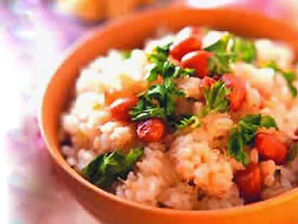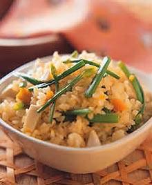 22.印度香米饭材料:香米300克,青甜椒1个,西红柿半个,茄子少许,胡萝卜半根,菜花少许。调味料:盐适量,鸡精少许、奶油2大匙,丁香、豆蔻、肉桂各少许。做法:1.香米淘洗干净;将青椒去蒂及子,洗净,切块;西红柿洗净,切丁;茄子洗净,切丁;胡萝卜洗净,切丁;菜花洗净,切成小朵。2.将奶油放进平底锅中,放入青椒煮2分钟,并不停搅动,加入丁香、豆蔻、肉桂再搅拌3分钟后加入西红柿煮3分钟。3.将香米倒入平底锅中,让调料覆盖米,然后加入茄子、胡萝卜、菜花和适量水,搅拌均匀,煮滚后,盖上锅盖炖煮20分钟。把火熄灭后,再焖10分钟后盛出食用。
