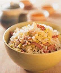 8.高丽菜饭材料:高丽菜2两培根3片白米1杯水1杯调味料:盐1又1/2小匙胡椒粉1小匙油1大匙蒜末2/3大匙做法:(1)将高丽菜、培根切0.5公分条状备用。(2)将米洗净沥干水分,加入1杯水浸泡15~20分钟备用。(3)将调味料放入米中略拌匀,再将高丽菜及培根条铺在上,放入电饭锅中煮熟,开关跳起后,先不要打开锅盖,让高丽菜饭再焖15分钟,最后用饭匙由下往上轻轻拌匀即可。