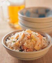 7.姜丁鲑鱼饭材料:嫩姜丁1/3杯鲑鱼丁1/2杯白米1杯水1杯调味料:酒1大匙胡椒粉1小匙香油2小匙做法:(1)将米洗净沥干水分,再加入1杯水浸泡15~20分钟备用。(2)鲑鱼丁加入调味料略腌10分钟备用。(3)再将嫩姜丁、鲑鱼丁及盐均匀铺在米上一起煮熟,开关跳起后再焖15分钟,最后用饭匙由下往上轻轻拌匀可。