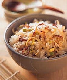 2.黄豆芽饭材料:黄豆芽4两黑木耳丝1/3杯(约1两)白米2杯高汤2杯调味料:盐2小匙酒1/2大匙香油2小匙色拉油1/2大匙胡椒粉1小匙做法:(1)将米洗净沥干水分,加入2杯高汤,浸泡15~20分钟,再加入调味料略拌匀备用。(2)黄豆芽洗净与黑木耳丝一起铺在米上,放入电饭锅中煮熟,煮好后需再焖15分钟,打开锅盖后,用饭匙由下往上轻轻拌匀即可。