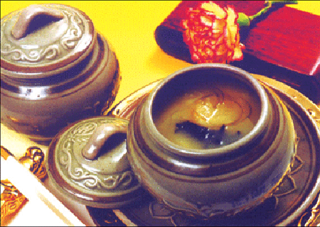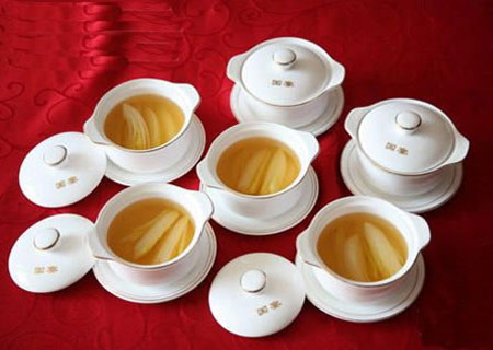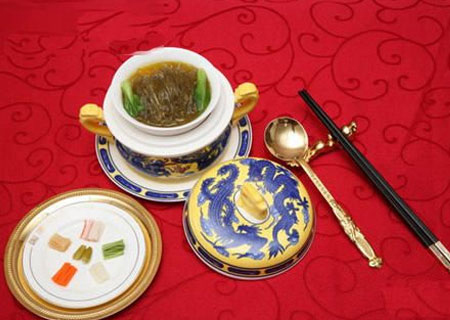 ![]() 国宴菜:乌鱼蛋汤 此汤被誉为钓鱼台台汤。它精选高级乌鱼蛋和国宴顶级清汤制作而成,微酸微辣,妙不可言。