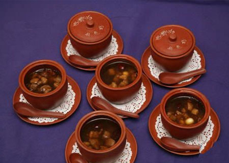 ![]() 罐焖三宝鸭 这是一道非常名贵的经典国宴菜,此菜选用精选优质填鸭与板粟、小枣、莲子炖煮后,装入国宴专用特制紫砂罐内蒸熟,具有很好的养生保健功效。