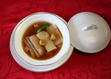 ![]() 蒜籽烧裙边 这是一道非常名贵的经典国宴菜,裙边为八珍之一,此菜选用上等裙边和国宴顶级浓汤烧制而成,有滋阳、补血和润肤功效,是国宴中的上菜。