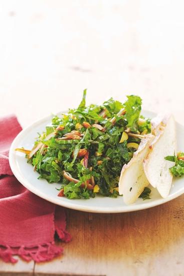 配料:新鲜柠檬汁适量、橄榄油适量、新鲜甘蓝1株、去核枣适量、杏仁适量、去核青橄榄适量