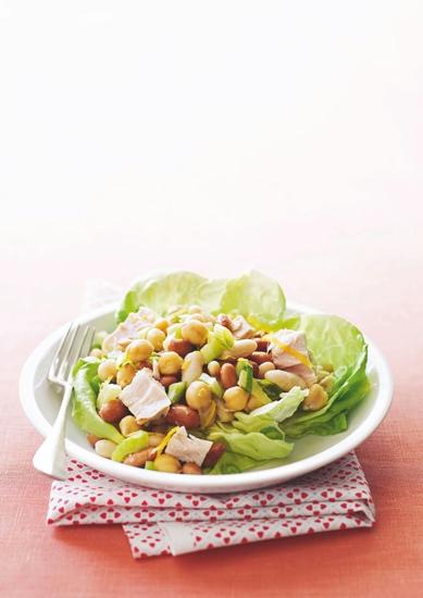 吞拿鱼富含有益于心脏的Omega-3脂肪,而沙拉中的三种豆类则含有丰富的纤维,起到降低胆固醇的作用。