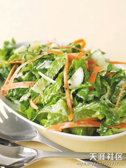 做法:1.将去皮黄瓜对半切开,切成半圆形薄片。将莴苣叶切成细片。将切好的黄瓜、莴苣叶放入沙拉碗,直接用削皮器将胡萝卜削成薄片,放在沙拉上。