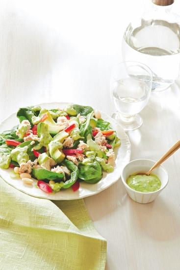 配料:新鲜柠檬汁3汤匙、橄榄油1汤匙、水1汤匙、第戎芥末(Dijon mustard)1茶匙、牛油果1个、新鲜荷兰芹叶2汤匙、香葱2汤匙、新鲜菠菜幼苗1袋、西芹末适量、芸豆罐头1听、吞拿鱼罐头2听。
