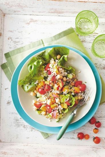 3.在沙拉碗内加入果醋、橄榄油、1/4茶匙盐,加入薏米后混合。之后加入黄瓜、黄桃、樱桃番茄、鹰嘴豆和罗勒叶,充分搅拌,盛放在生菜叶上即可食用。