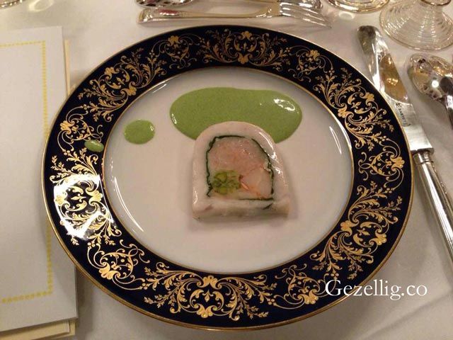 这是一道冷菜,采用了法国传统的肉冻烹饪手法,用鱼虾取代鹅肝,配上葡萄酒,搭配上西洋菜打碎后做成的豆瓣酱,清新爽口。