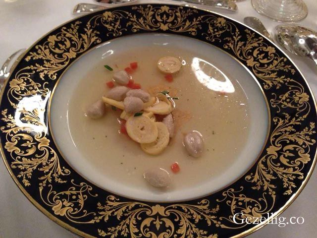 法式教皇清汤(汤)。第二道菜,别看是道汤,但在西餐里一名大厨好不好可都是能从汤里看出来的。营养精华可都在汤里,通常都是要经过长时间的熬制和去油脂的过程。这道汤底最重要的就是鲜和清。上桌的时候都会配上蔬菜或鸡蛋,以及一些肉。