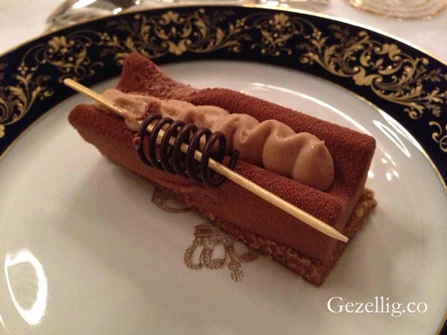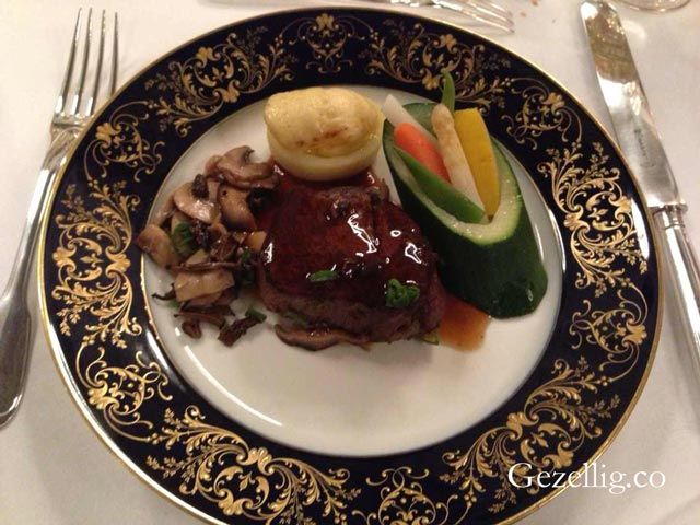 阿根廷腓里牛排与羊肚菌蘑菇配马德拉酱(主菜);西葫芦什锦蔬菜配酥皮焗土豆(配菜)。到主菜了,这是一道阿根廷名菜。Tournedos是位于里脊末端的那块肉,通常都是厚且圆,根据个人口味可以三分至五分熟,鲜嫩至极。上桌时要搭配Madeira酱汁,是专门为肉类调配的。本次的菜还用了羊肚菌菇,因外形酷似羊肚而得名。蔬菜选了荷兰人超喜欢的西葫芦,挖空后,放上其他蔬果。另一个是酥皮焗土豆, Dauphinioise 这个词来源于法语东南部的传统地区Dauphine,这道菜是将土豆切片,然后和奶酪一起焗制,表皮是脆的。国宴上这道菜已经经过改良,做成了一小块。