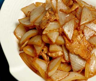 切好的洋葱蘸点干面粉,炒熟后色泽金黄;质地脆嫩,味美可口。炒洋葱时,加少许白葡萄酒,则不易炒焦。
