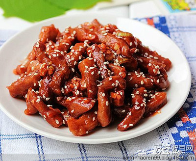 做法:1)莲藕洗净2)去皮3)切成条状4)锅内放油5)将面粉、盐、水调成面糊状,莲藕裹上面糊6)放油锅中炸之7)全部炸好盛入盘中8)锅内留少量油放芝麻、白糖、蕃茄酱米醋9)炒成糊状10)放炸好的藕条11)迅速翻炒一下即可烹饪制作过程