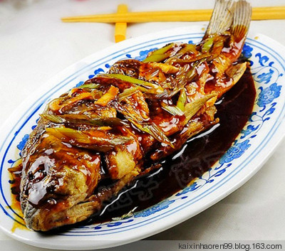 做法:1)将鱼刮鳞,去内脏,挖腮,用冷水洗净。2)将鱼身两面切成月牙形花刀。3)将盐和白酒撤入鱼身内腌制10分钟。4)葱姜蒜切成丝备用。5)并在刀口处及鱼的全身均匀地涂上一层淀粉。6)锅中放油烧至七成热,手提鱼尾放入油锅内,其刀口处立即张开。用勺子把热油浇在鱼身定型后全部下入油锅。7)炸至金黄色,捞在鱼盘里。8)炒锅留油少许,烧至六成热,爆香葱姜蒜。9)加入醋、酱油、白糖、清水,烧浓后即用湿淀粉勾荧,淋上熟油少许,迅速出锅浇在鱼身上即成。