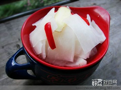 做法:1)白萝卜洗净去皮。2)白萝卜去皮切薄片、姜切片、红椒切丝。3)白萝卜片用适量盐腌十分钟。4)用凉开水将盐水洗去。5)白萝卜片控水调入适量醋。6)在萝卜片上均匀的铺上白糖。7)将姜片、红椒丝铺在上面,入冰箱冰镇一晚即可。